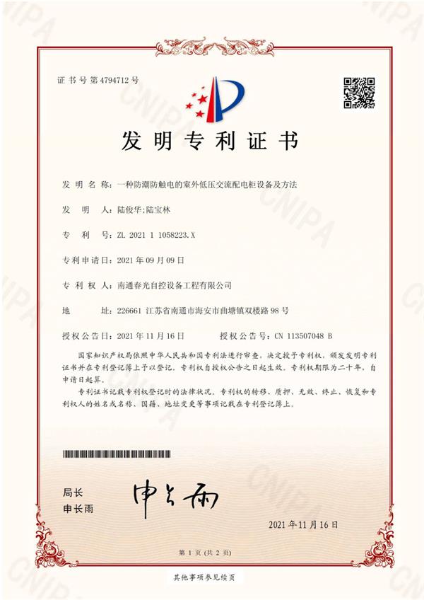 一種防潮防觸電的室外低壓交流配電柜設(shè)備及方法發(fā)明專利證書(shū)