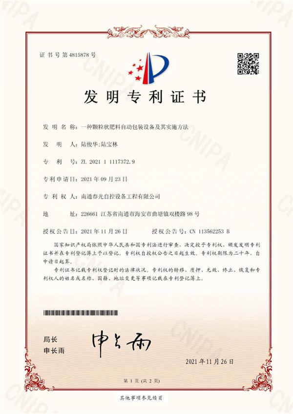 一種顆粒狀肥料自動包裝設(shè)備及其實施辦法發(fā)明專利證書